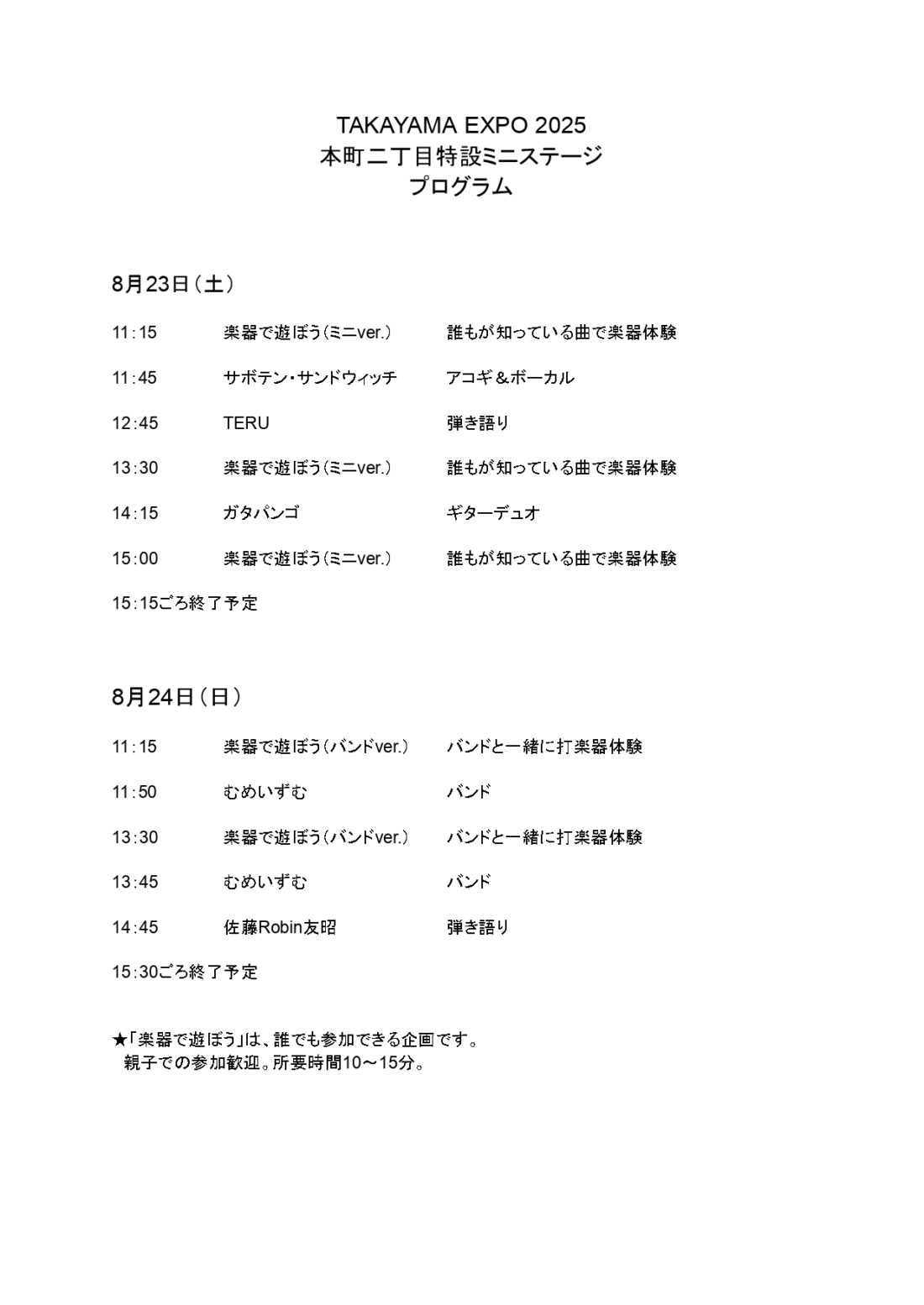 HOME> ニュース一覧> ニュース詳細 TAKAYAMA EXPO 2025 本町2丁目ミニステージプログラムのご案内 8月23~34日に開催される「TAKAYAMA EXPO 2025 」で、 本町2丁目エリアにもミニステージが設置されます。 ミニステージのプログラムを掲載いたしますので、ぜひご覧ください! お知らせ一覧に戻る>>